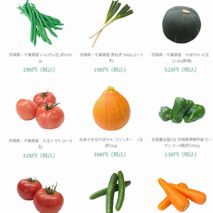・きゅうり・オクラ・ミニトマト・モロヘイヤ・ピーマン・長ねぎ・玉ねぎ・じゃがいも・エシャレット ・なす・にがうり・アスパラガス・さつまいも・マッシュルーム・小松菜・チンゲン菜・いんげん・れんこん・さといも・かぼちゃ・しめじ・まいたけ等の旬の定番野菜から、